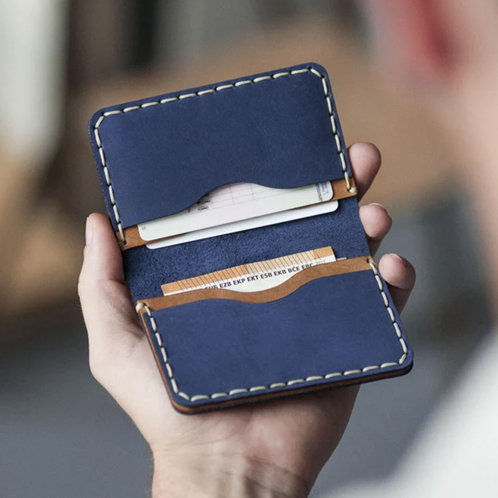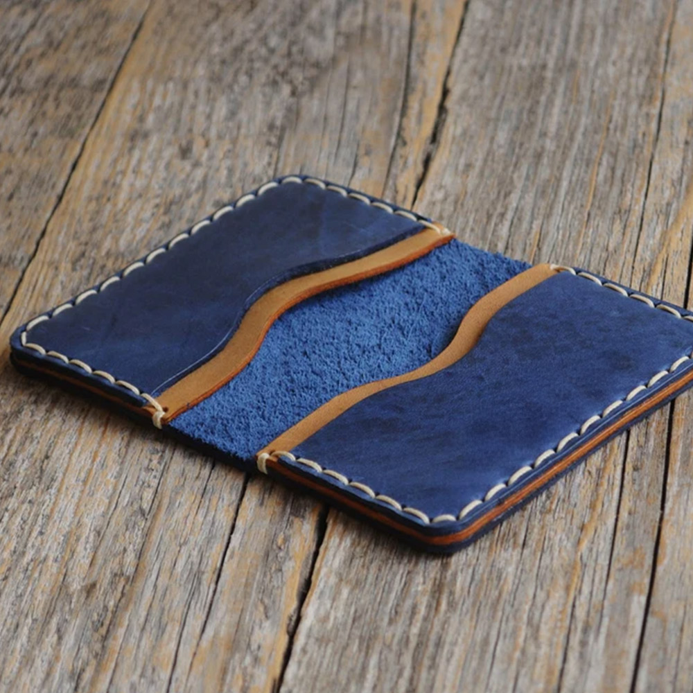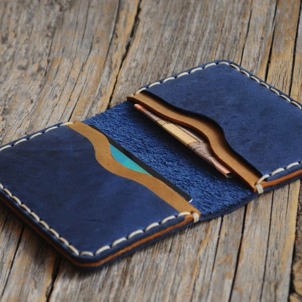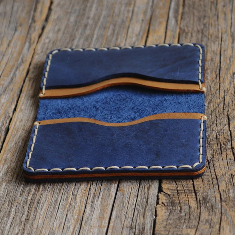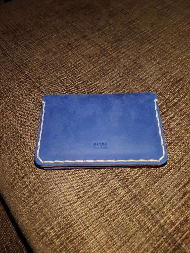 You want a wallet that fits everything without adding an extra two inches to your pocket. Style and functionality meet with this sleek, hand-sewn bovine leather wallet. Four strategically placed pockets inside the rustic genuine leather pouch keeps all of your everyday essentials organized and ready to grab. Each of our wallets is handmade out of quality leather that naturally has inconsistent texture and markings creating a unique wallet for you or your loved one. Personalize this stylish, unique brown and blue leather wallet with initials or a custom message for a thoughtful and functional gift.