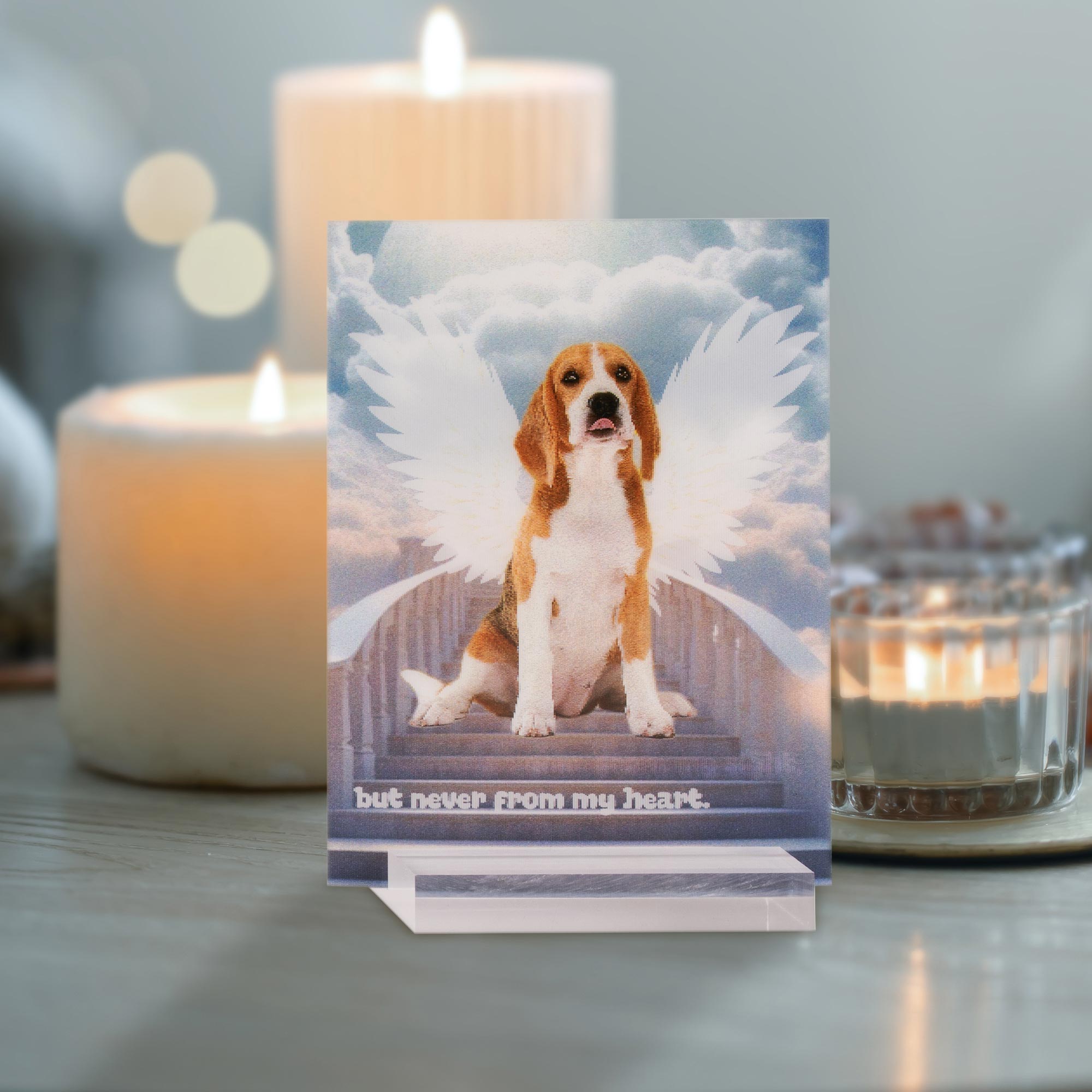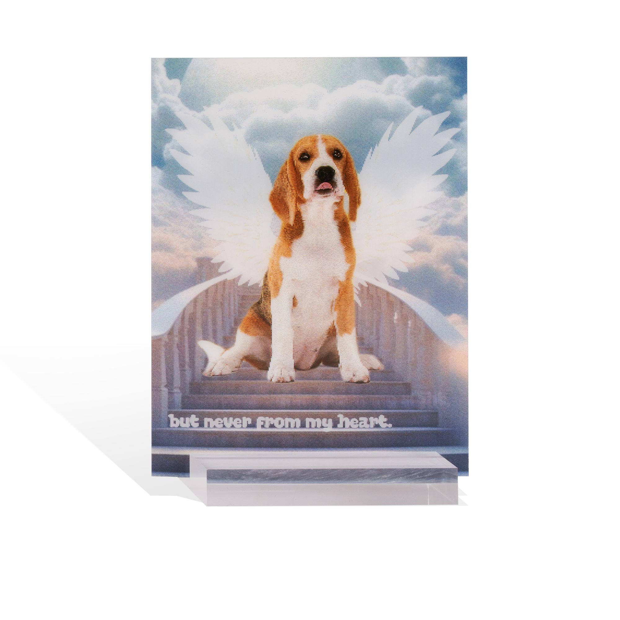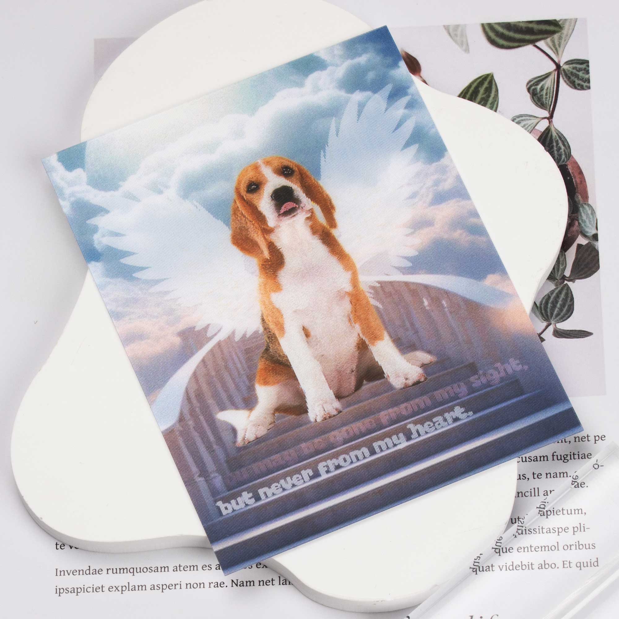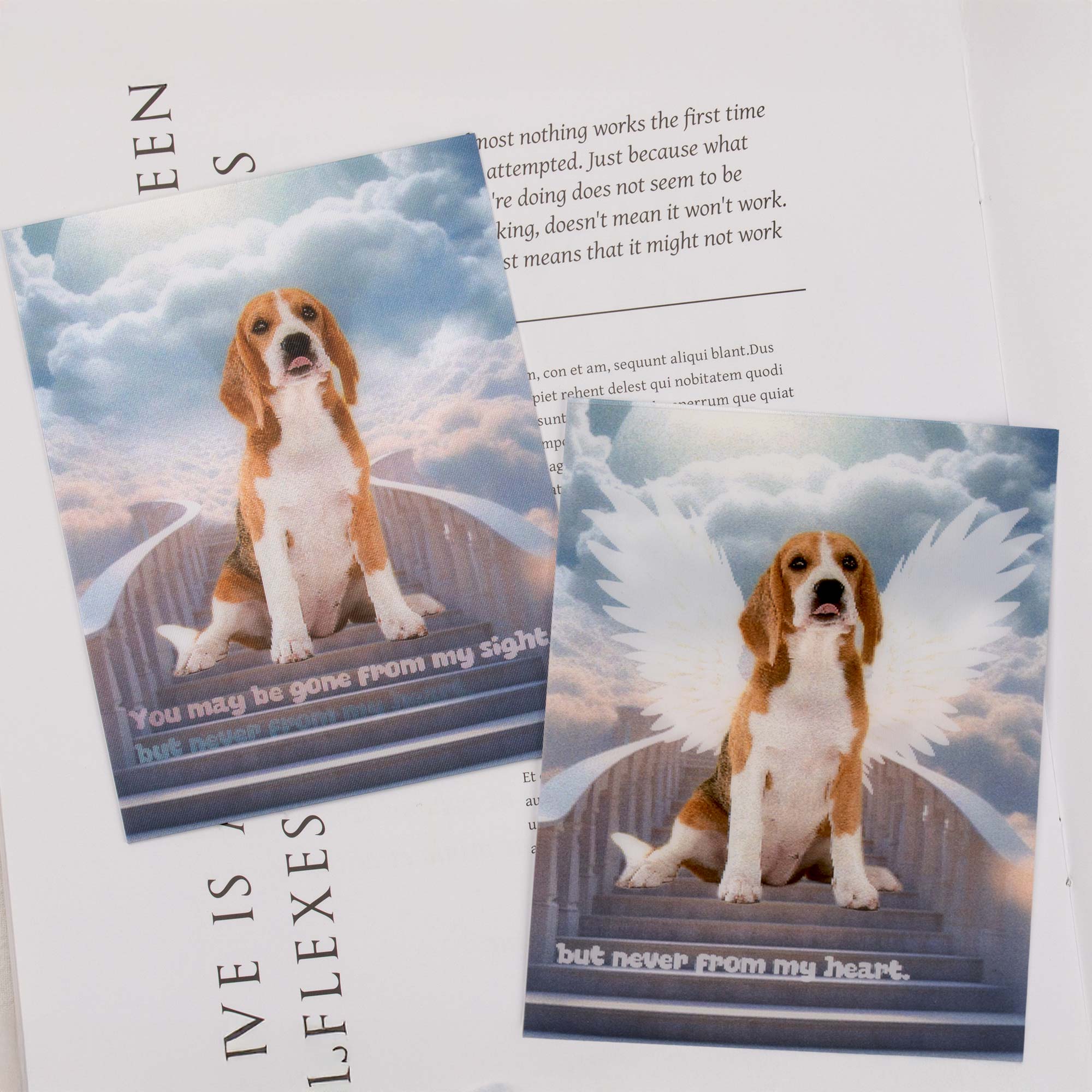 Honor your beloved pet’s memory with this deeply touching lenticular flip card. Upload your favorite photo of your dog, cat, or other furry friend—and as the card moves, their image transforms into a gentle angel with wings and a halo. Add your own message of love or remembrance to complete this personal tribute.