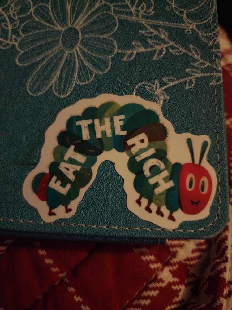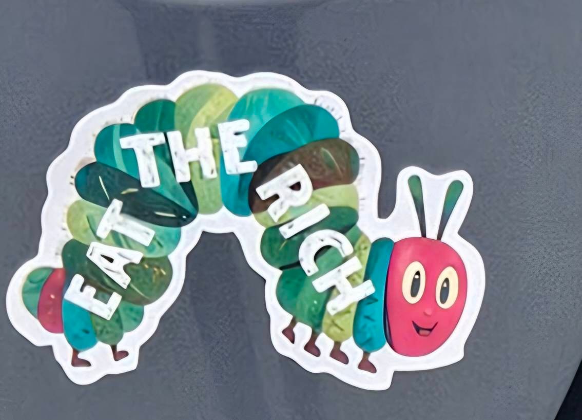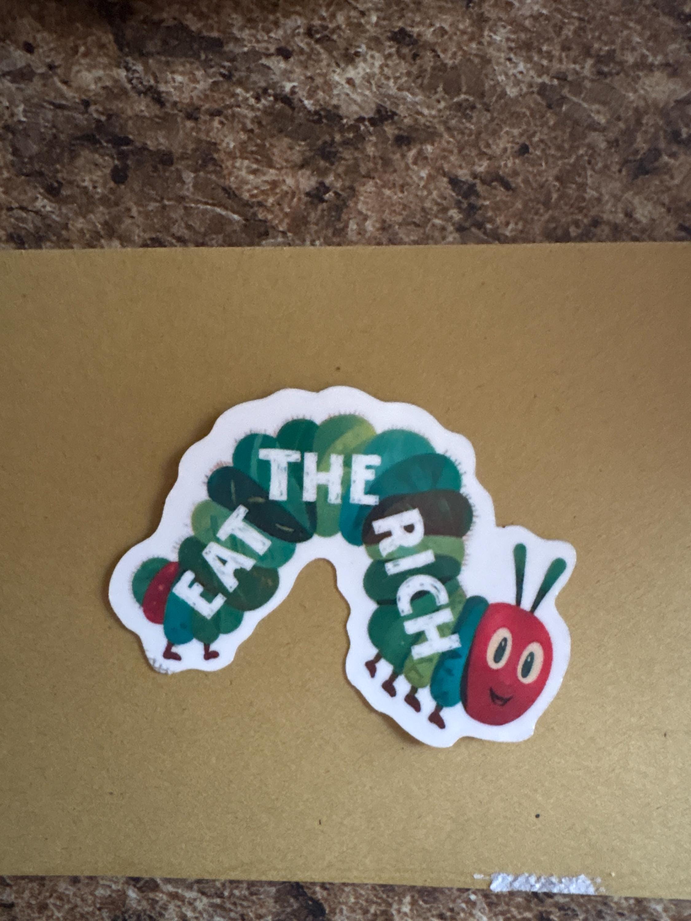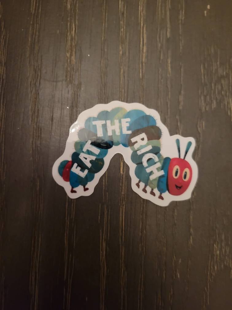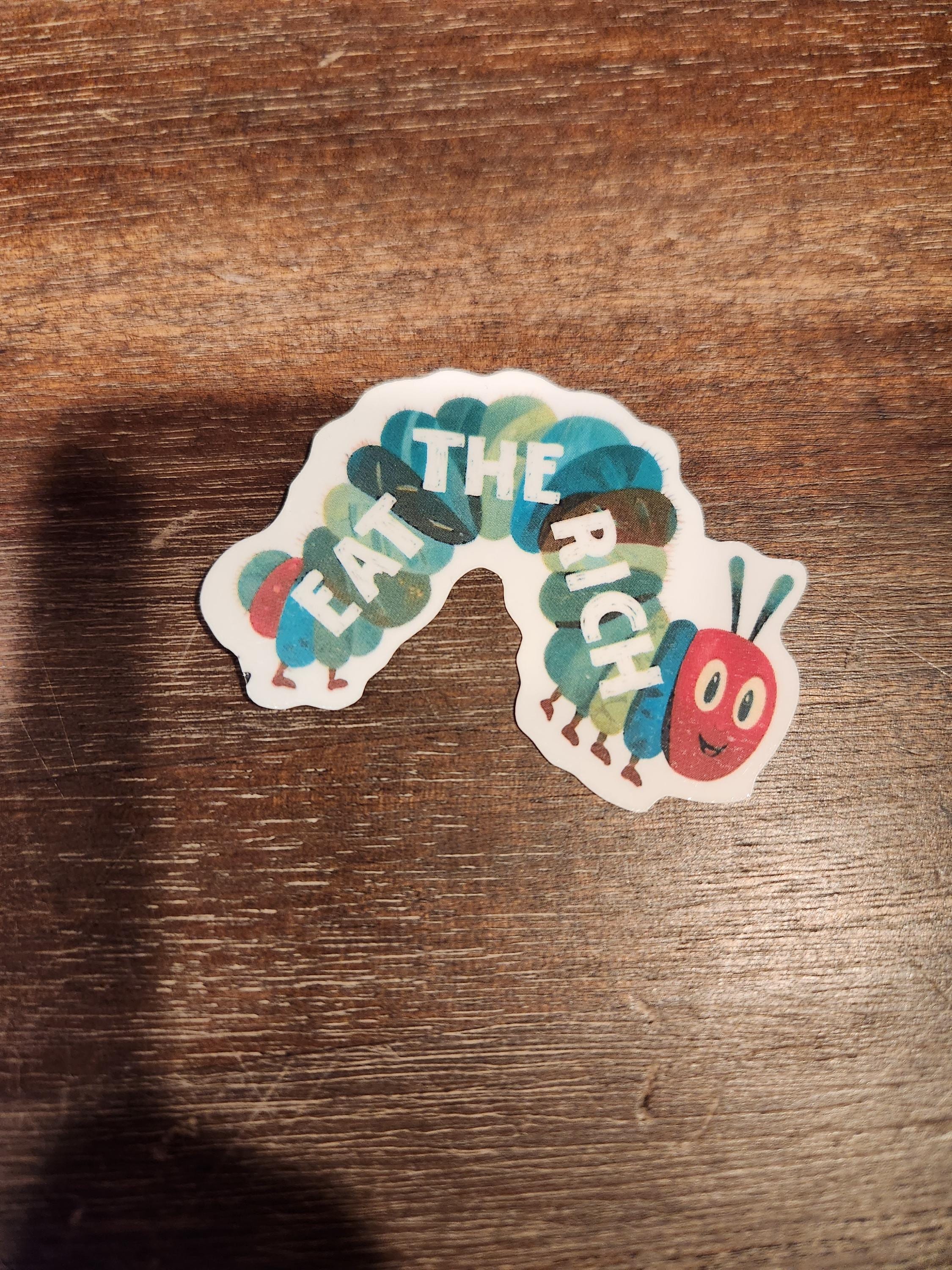 Embrace your anti-capitalist beliefs with this striking "Eat the Rich" caterpillar vinyl sticker! Designed for the progressive socialist who advocates for pay equality and social justice, this politically charged sticker is a bold statement on good ethics and the need to tax the rich. Perfect for laptops, water bottles, or Hydroflasks, this sticker not only adds a touch of rebellion but also sparks conversations about economic fairness wherever you go.