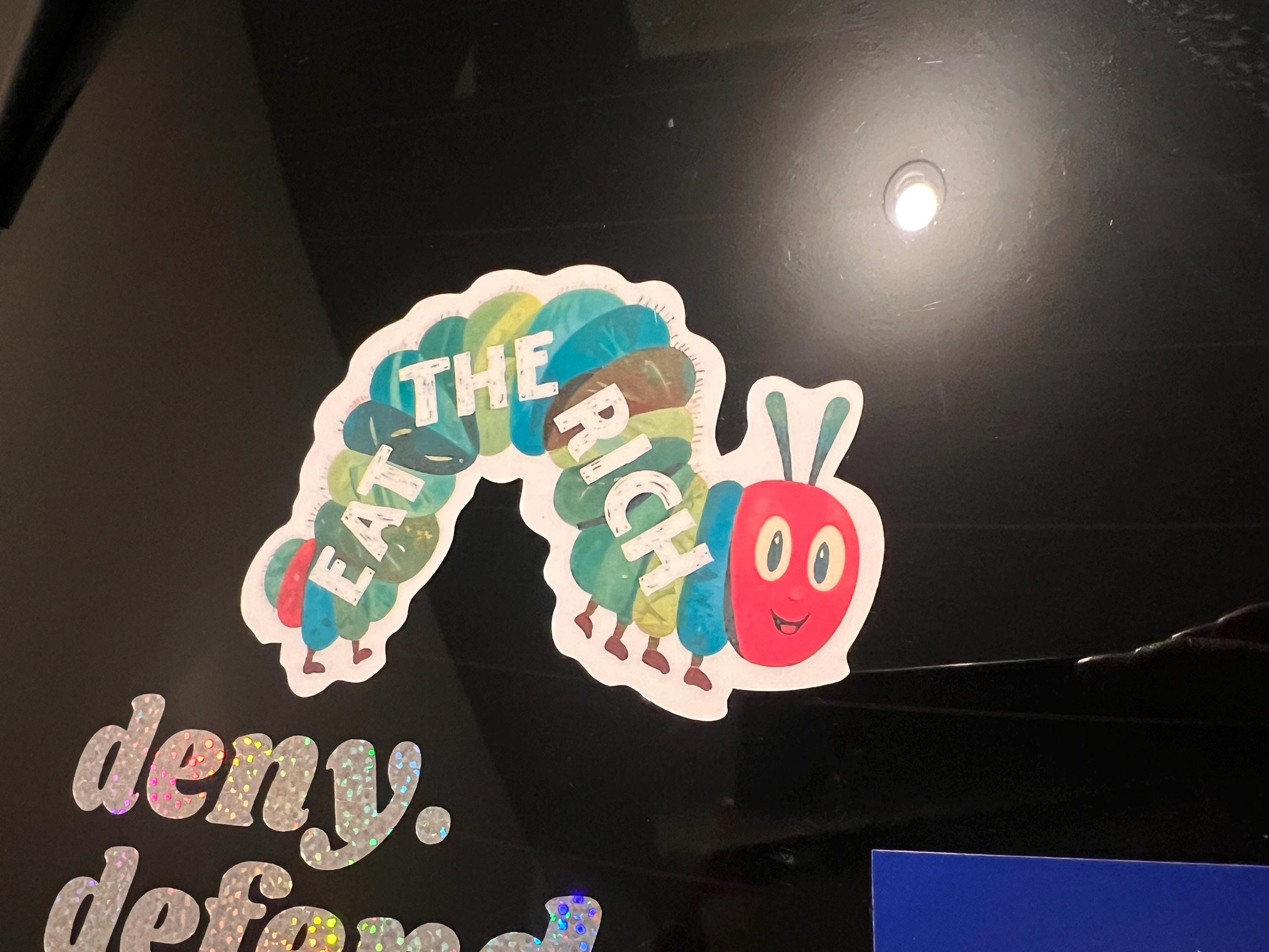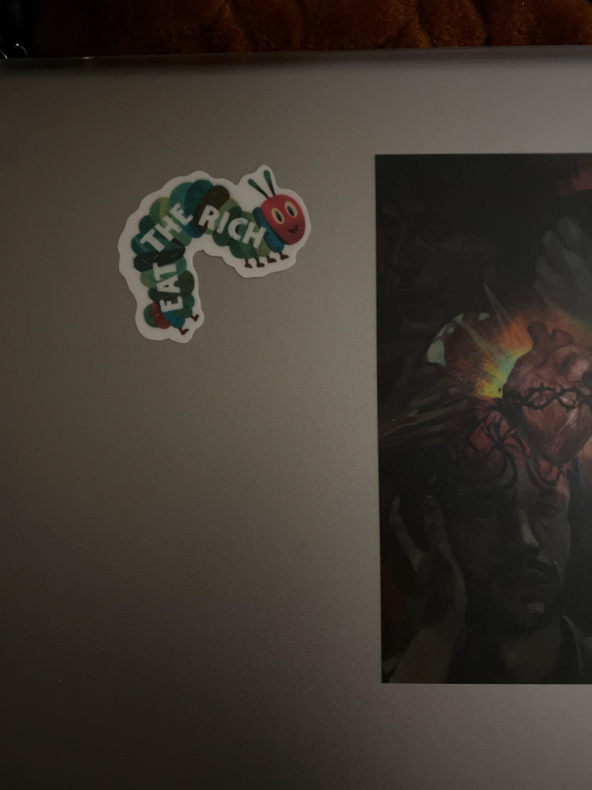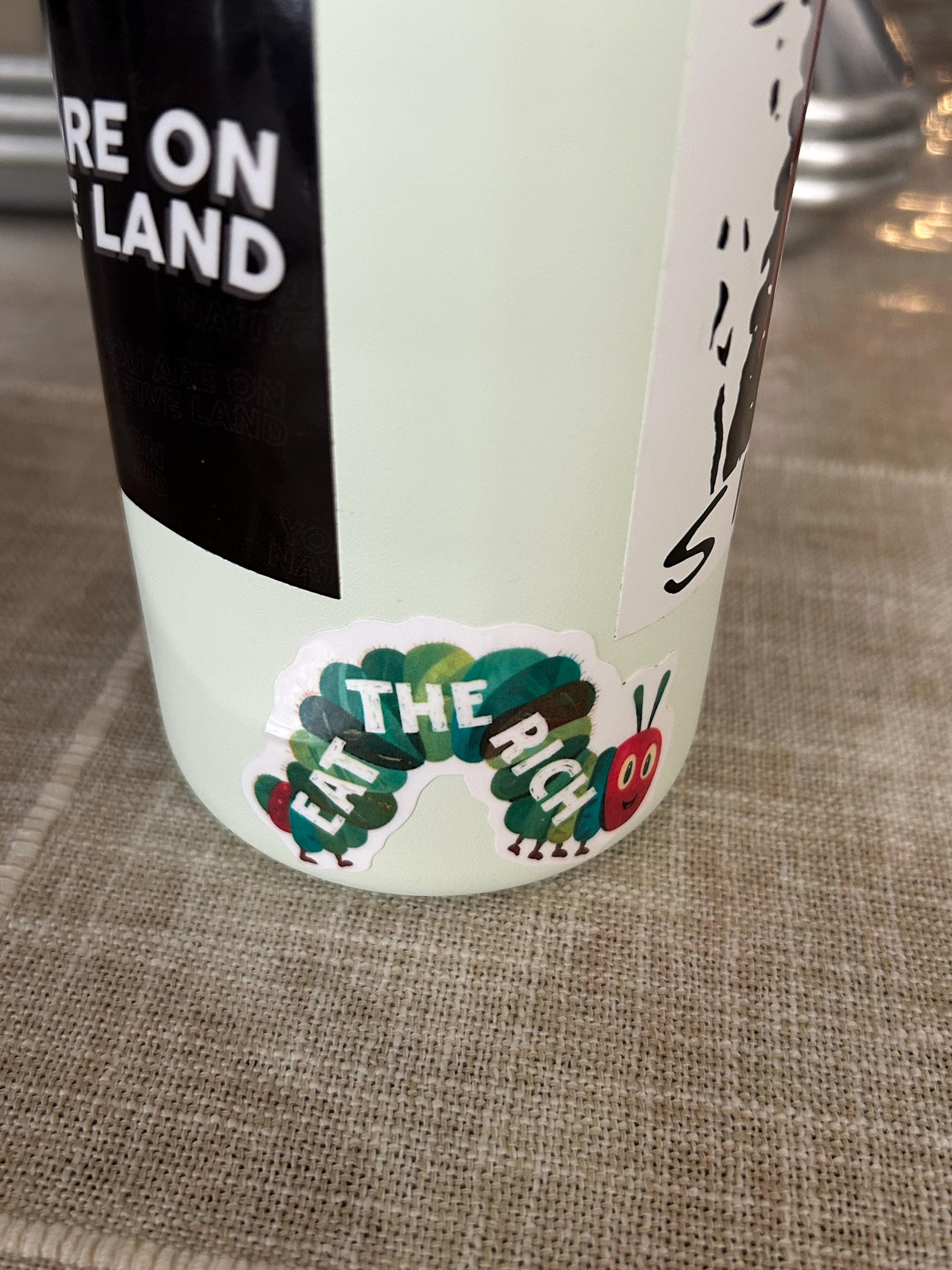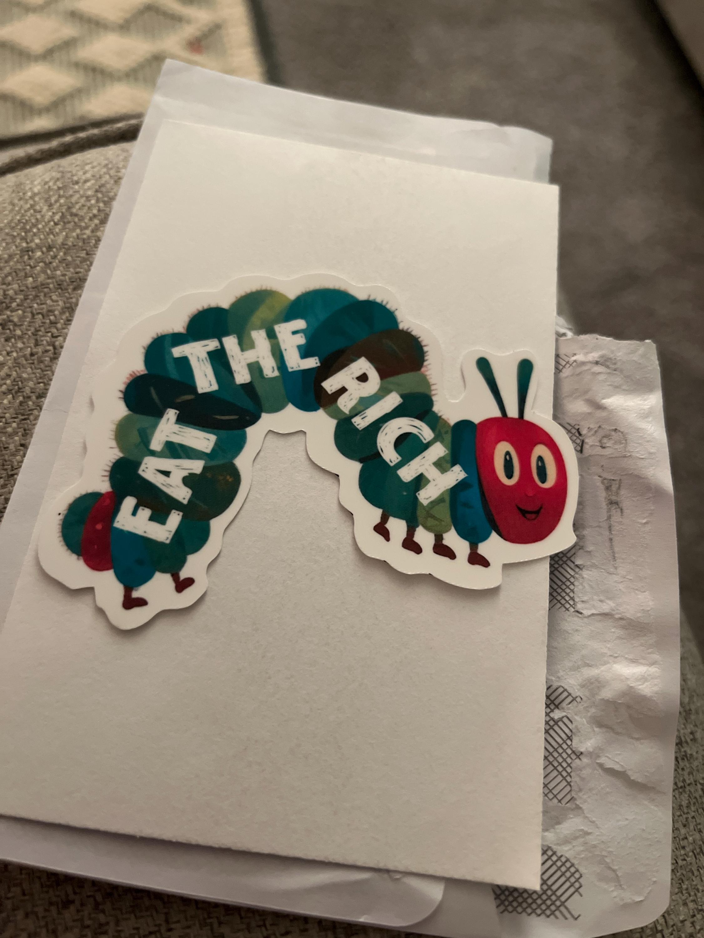 Embrace your anti-capitalist beliefs with this striking "Eat the Rich" caterpillar vinyl sticker! Designed for the progressive socialist who advocates for pay equality and social justice, this politically charged sticker is a bold statement on good ethics and the need to tax the rich. Perfect for laptops, water bottles, or Hydroflasks, this sticker not only adds a touch of rebellion but also sparks conversations about economic fairness wherever you go.