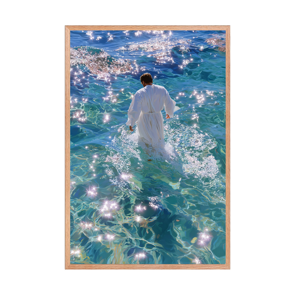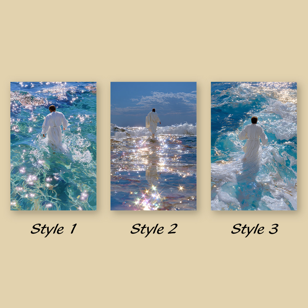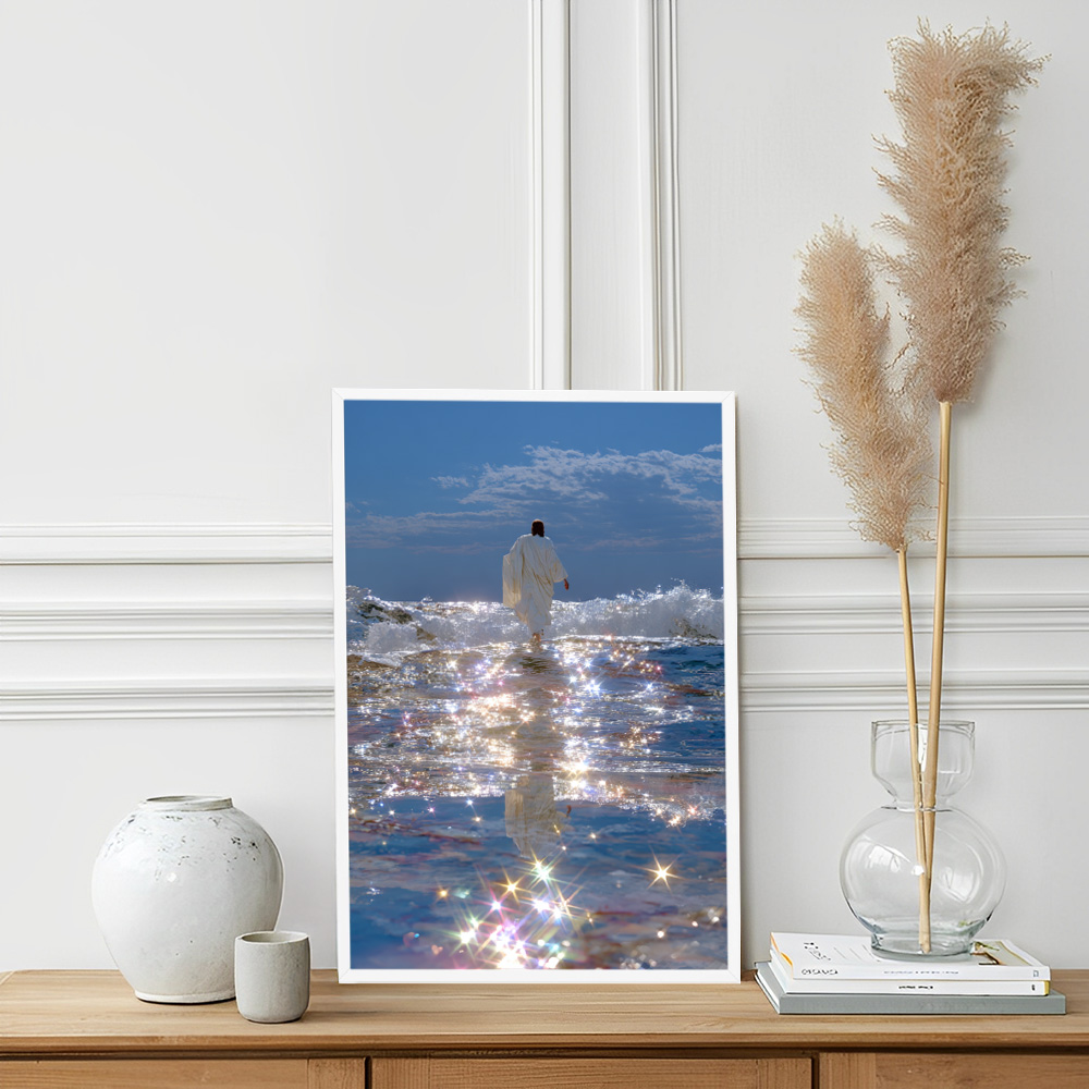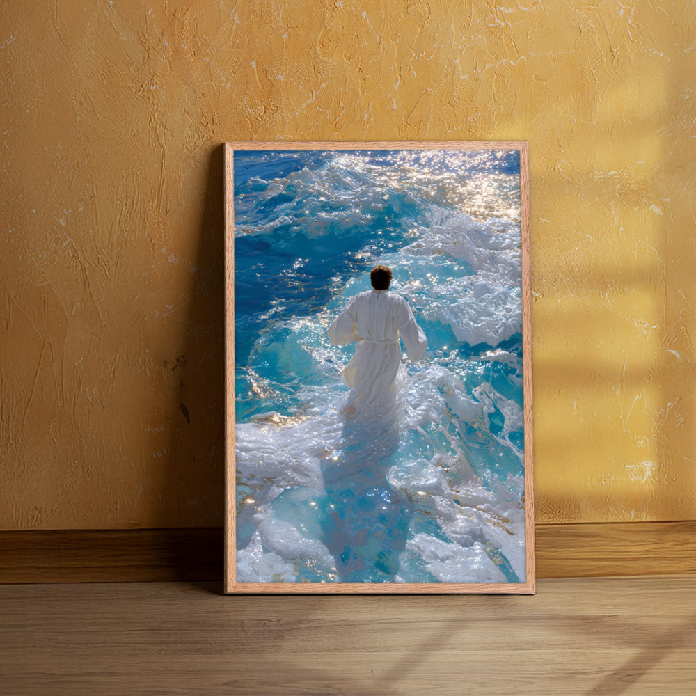 This wall painting depicts the classic scene of Jesus walking on the sea. The picture is solemn and sacred, implying the courage and comfort in faith. With the sea as the background, the color tone is tranquil and profound, full of sacred atmosphere.