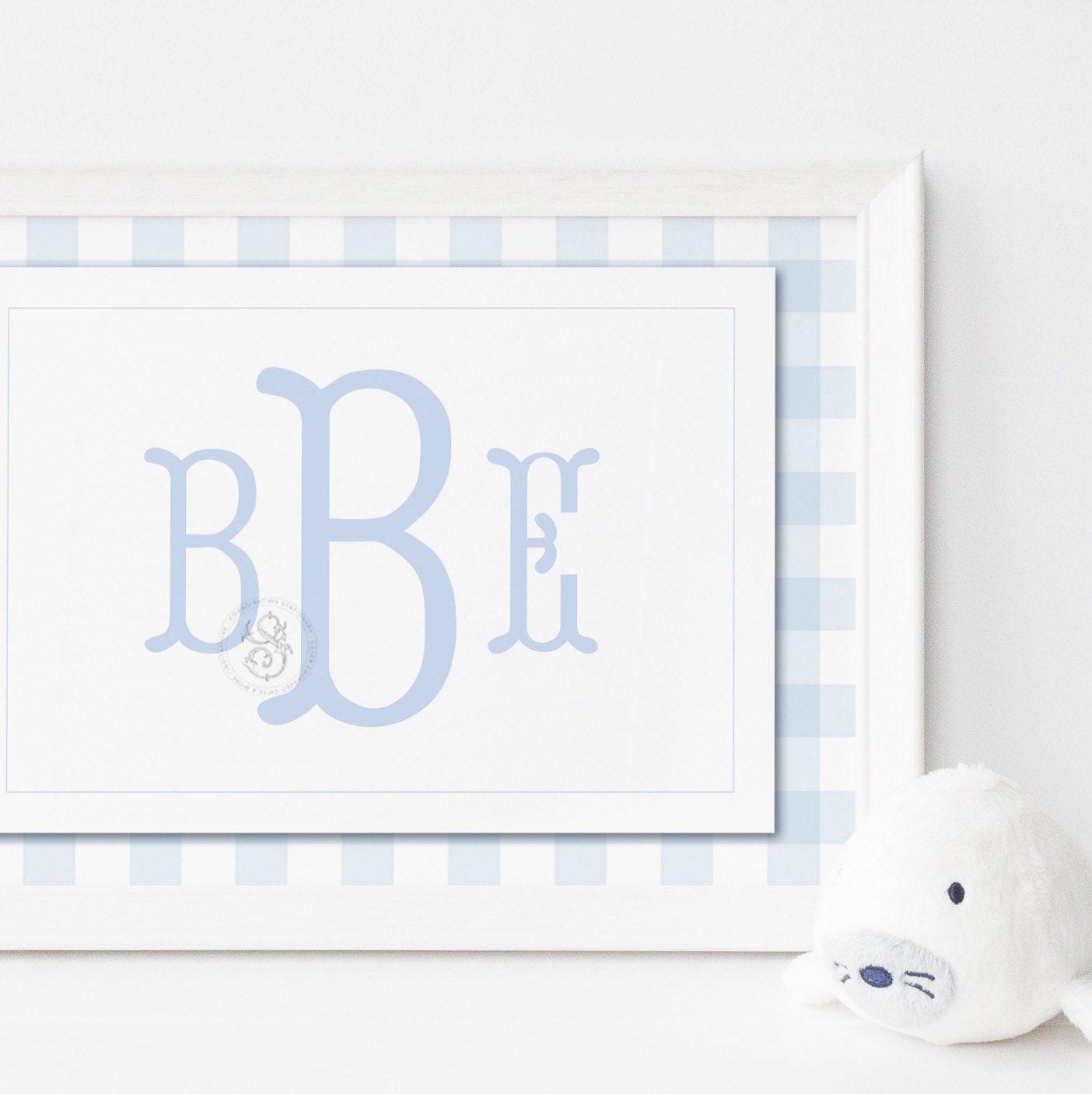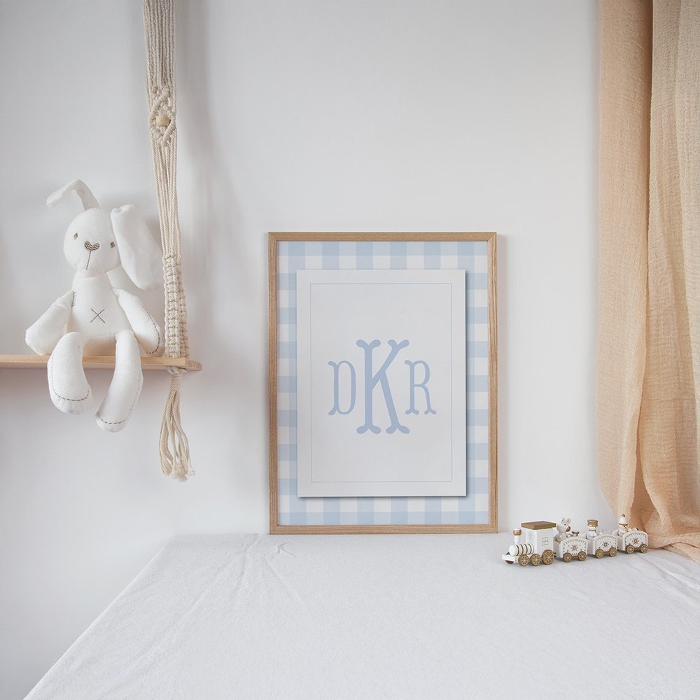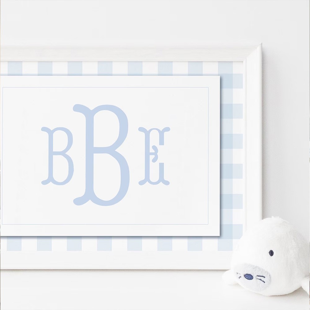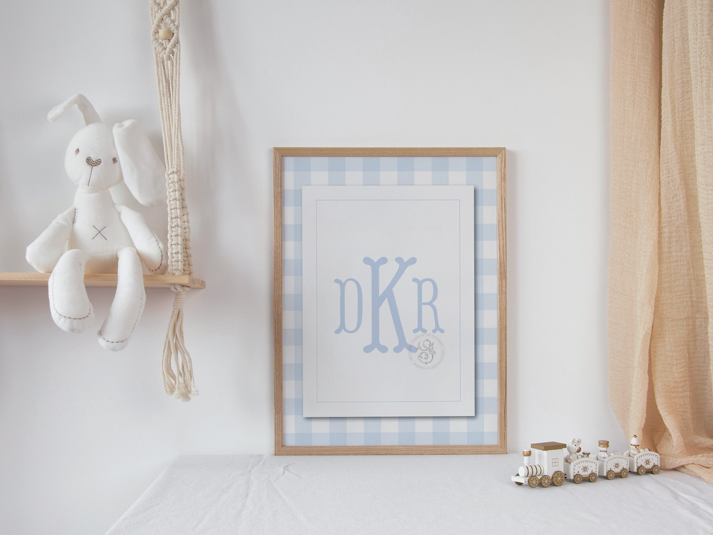 This printed blue gingham printed fishtail monogram wall art will enhance your little boy's room. Perfect for baby boy's nursery.
