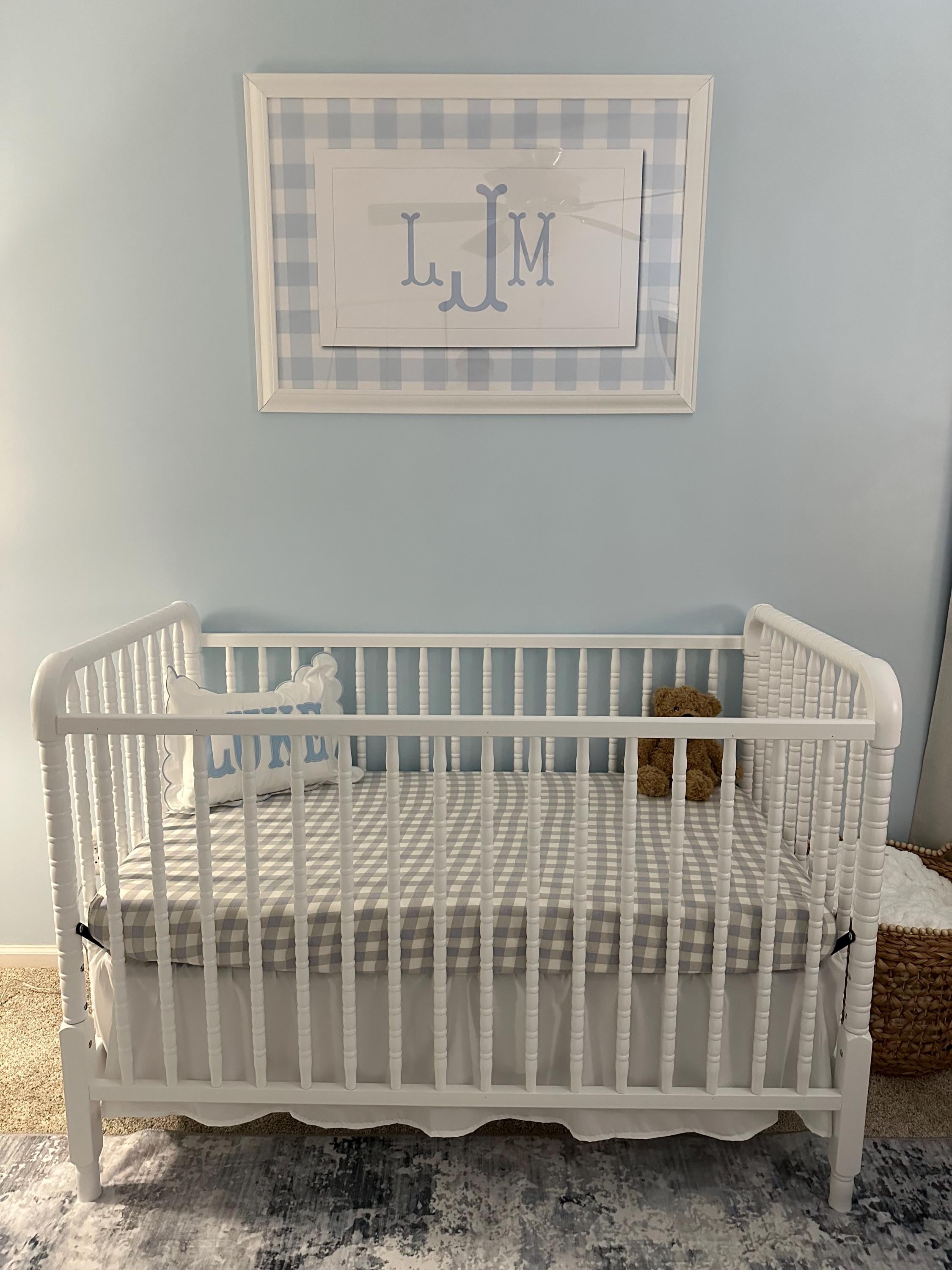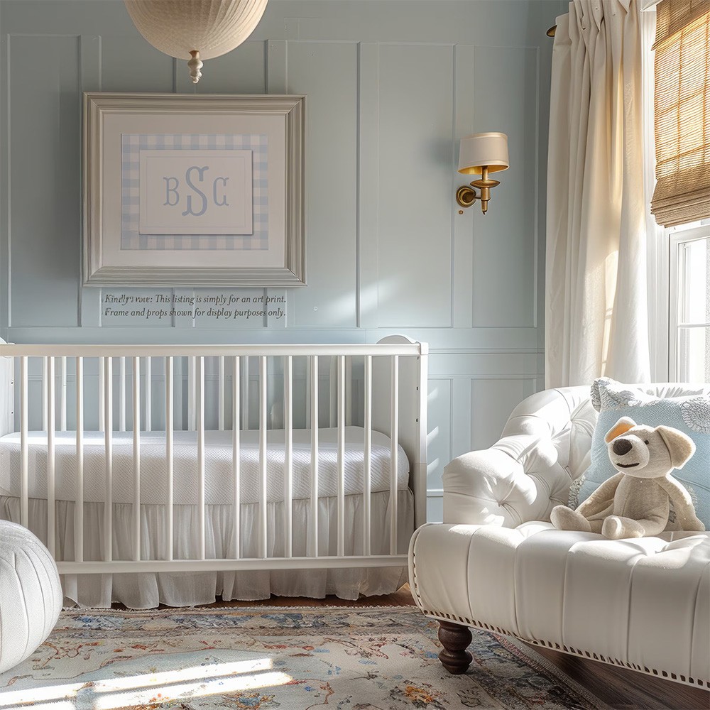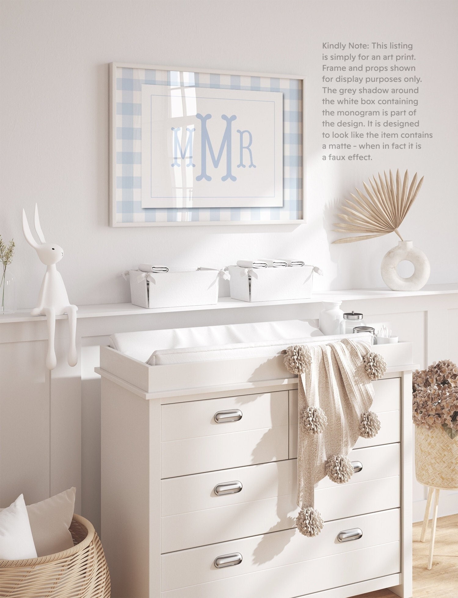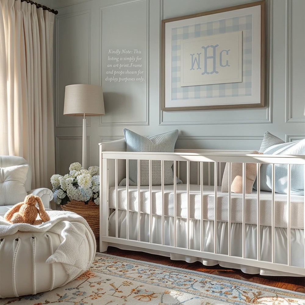 This printed blue gingham printed fishtail monogram wall art will enhance your little boy's room. Perfect for baby boy's nursery.