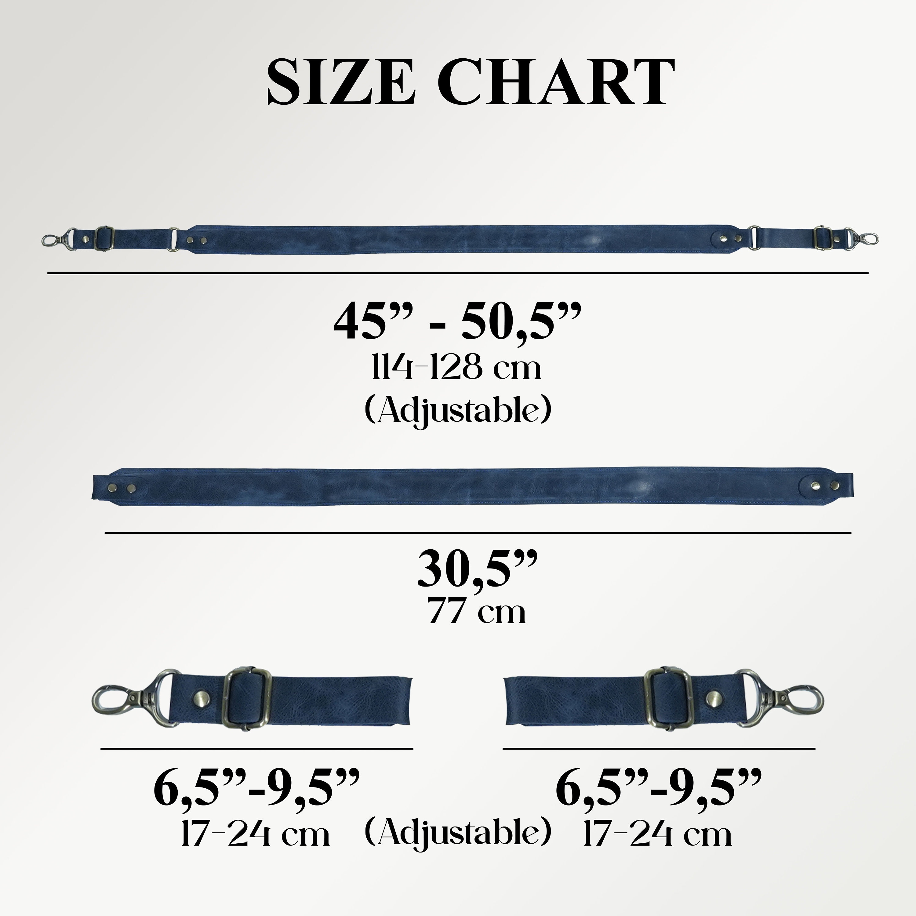📌 Size: The length is adjustable from 114 - 128 cm (45” - 50,5”). Width around the neck is 30,5 ( 77 cm). The attachment is adjustable from 17-24 cm (6,5”-9,5”).