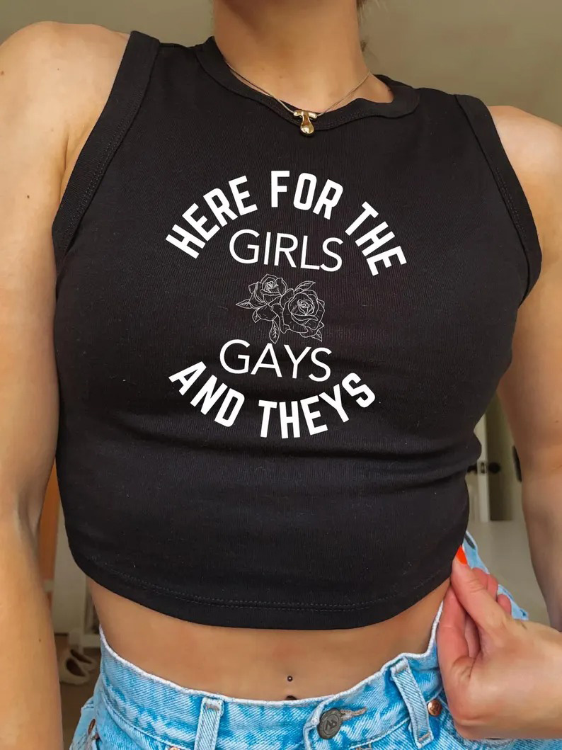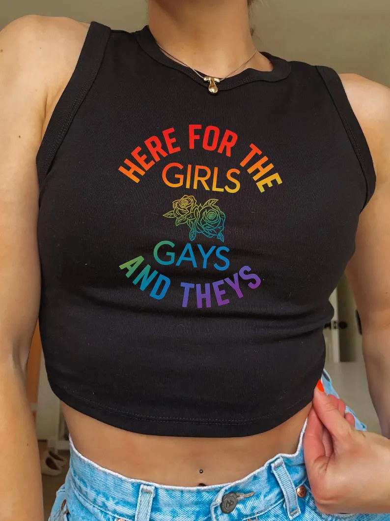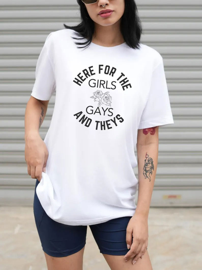 Pride Shirt "Here for the Girls, Gays, and Theys" is a statement of support for the queer community and people you love most. A Noteworthy original design, hand-printed and made to last.