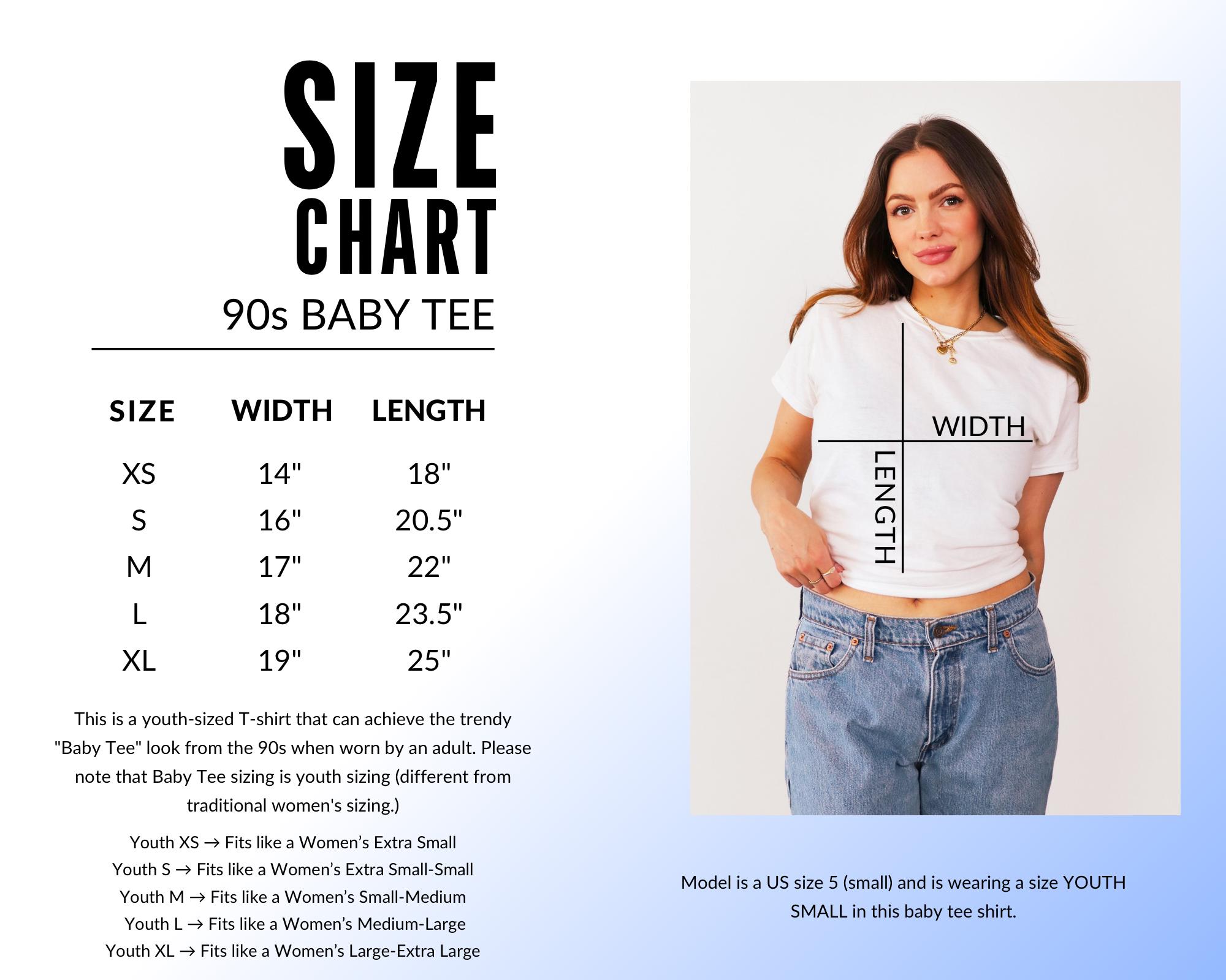 90s-Inspired Baby Tee: Slightly cropped and fitted. Runs in youth sizing, so size up if you prefer a less snug fit.