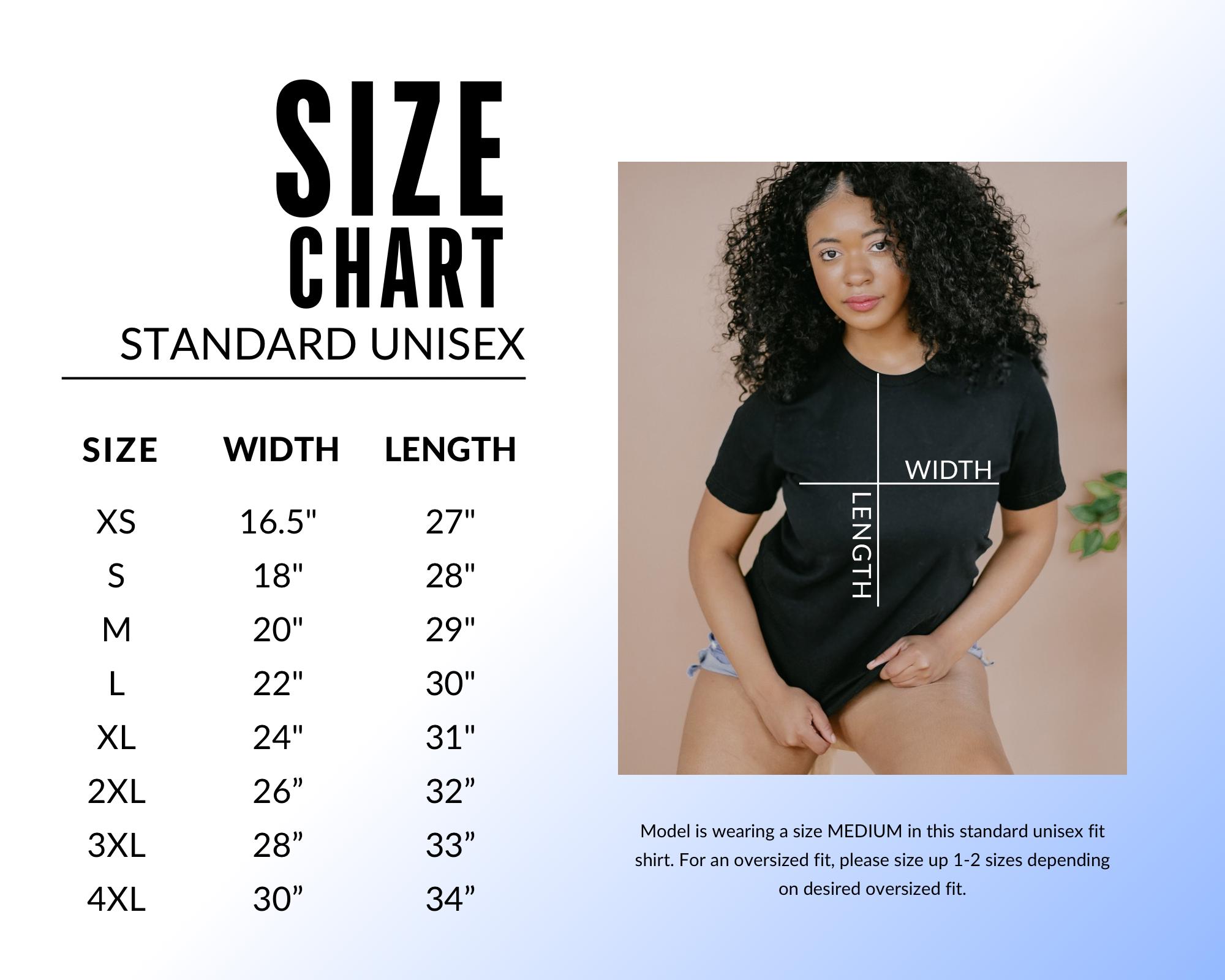 For a relaxed or oversized fit, size up 1-2 sizes or select the standard unisex tee.