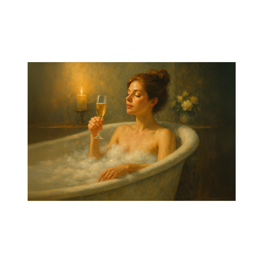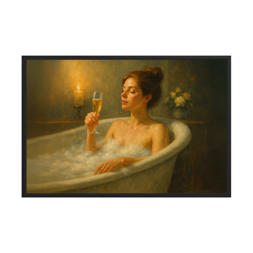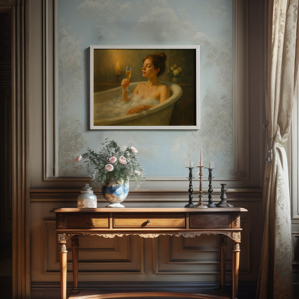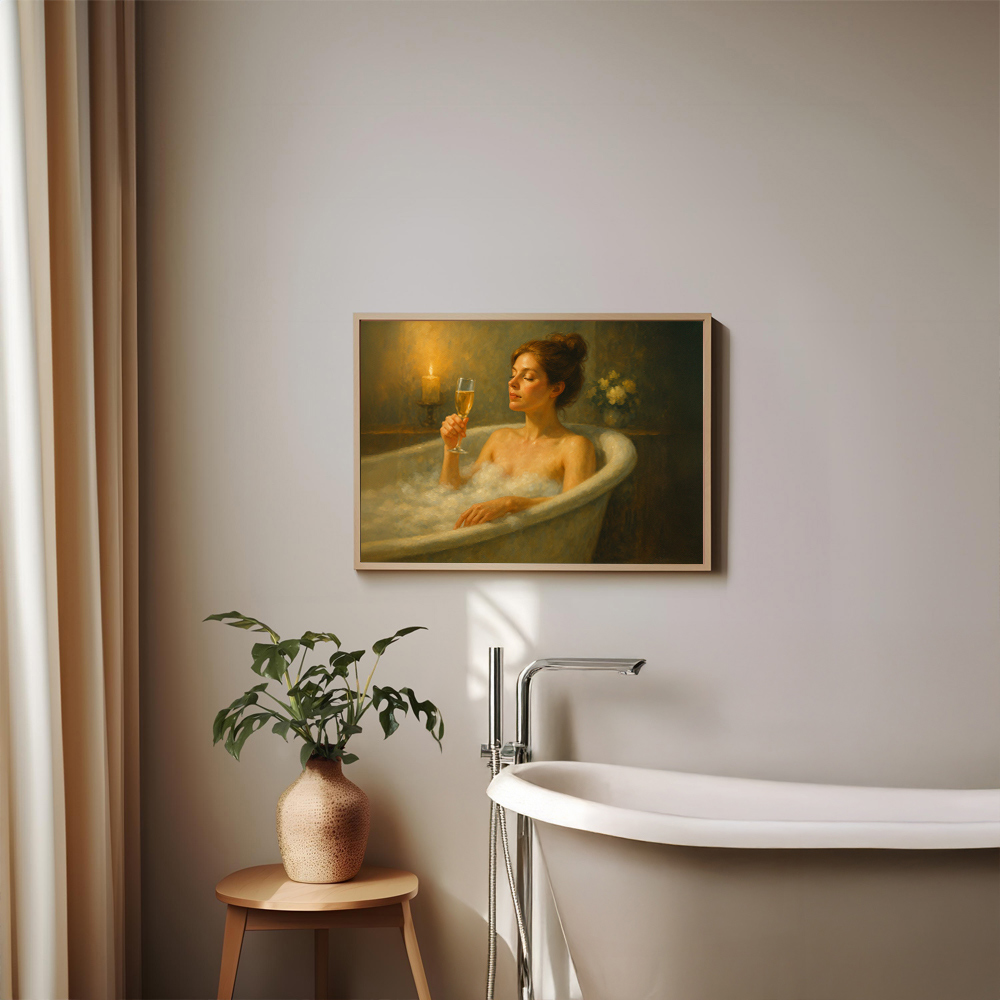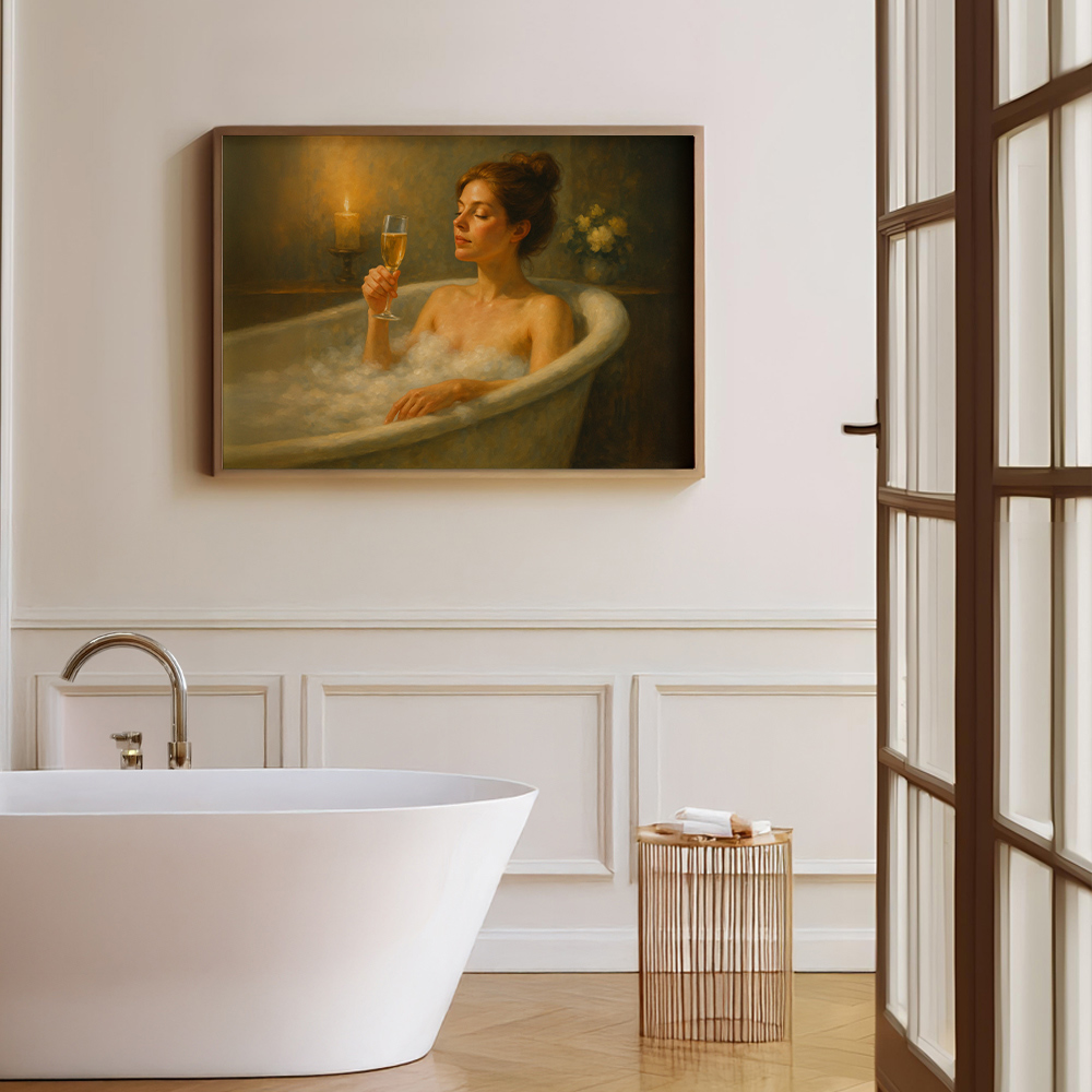 This product uses classic oil painting style to present a quiet moment of an elegant woman holding champagne while taking a bath, conveying a relaxing and romantic atmosphere. The picture has warm and soft tones, with a retro artistic feel. The work can be framed without a frame or in a variety of frame colors (brown, red oak, white, black), suitable for different home styles.